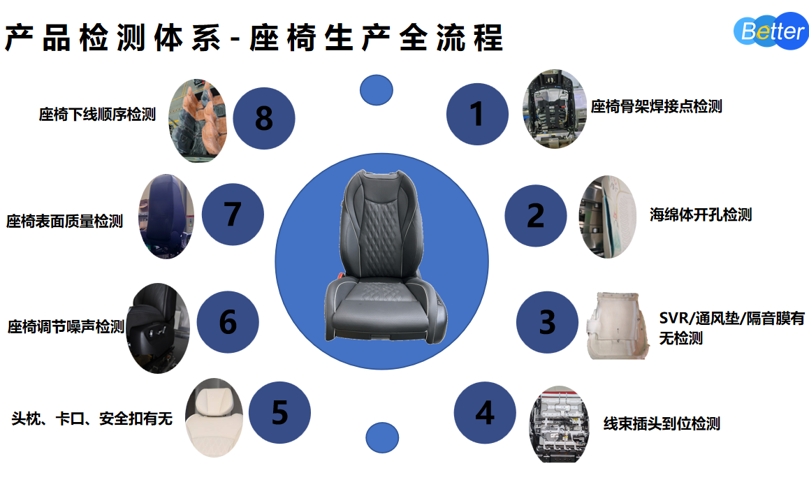貝拓科技通過將先進(jìn)的視覺檢測(cè)技術(shù)與深度學(xué)習(xí)算法深度融合,為汽車座椅組裝產(chǎn)線打造高效、精準(zhǔn)的多工序自動(dòng)化質(zhì)量檢測(cè)解決方案。工序包含了骨架焊接點(diǎn)檢測(cè)、導(dǎo)套配置檢測(cè)、海綿體檢測(cè)、座椅噪聲檢測(cè)、熨燙等,實(shí)現(xiàn)了對(duì)產(chǎn)品質(zhì)量的全程把控。